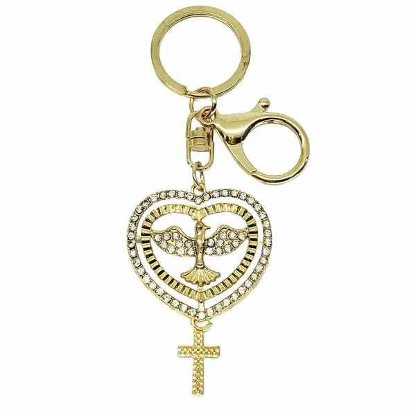 Apresentamos o Chaveiro Dourado com a Imagem do Espírito Santo, Coração e Cruz, adornado com Strass, uma peça de devoção excepcionalmente rica em significado. Mais do que um acessório, este chaveiro é um verdadeiro amuleto de fé que reúne três símbolos fundamentais do cristianismo: a pomba do Espírito Santo (conforto e guia divina), o Coração (amor incondicional) e a Cruz (salvação e proteção).