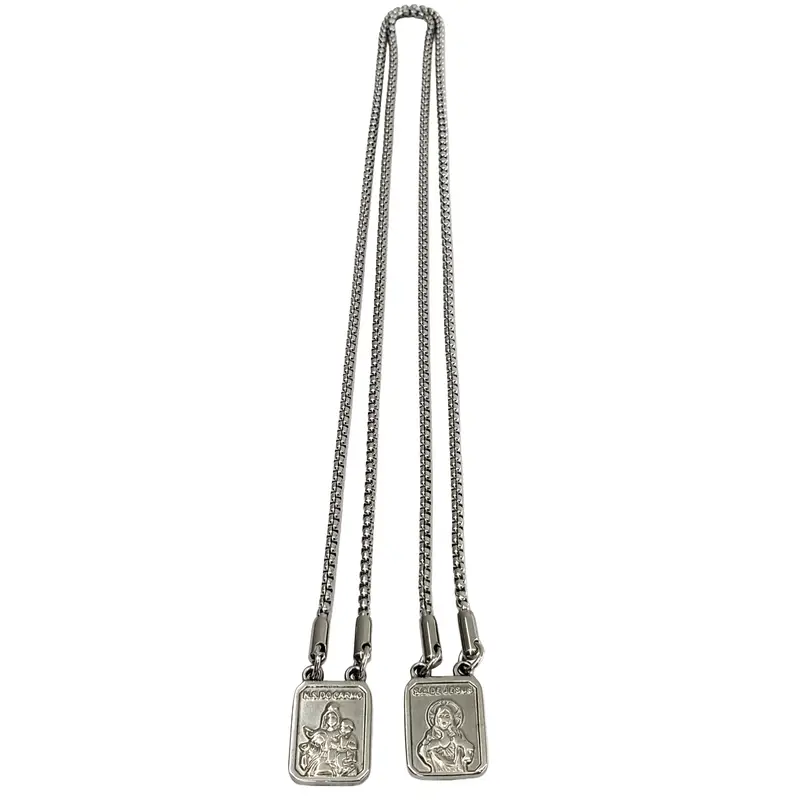 • 1 (um) Escapulário Sagrado de aço inoxidável, com as imagens de Nossa Senhora do Carmo e do Sagrado Coração de Jesus.