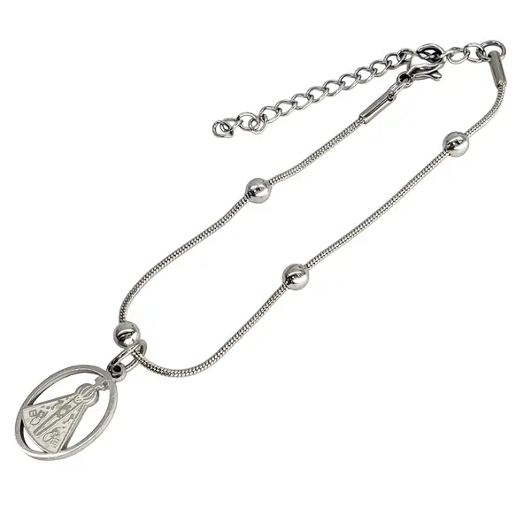 1 (uma) Pulseira de Aço Inox com corrente serpente, pingente de Nossa Senhora Aparecida e detalhes em bolinhas.