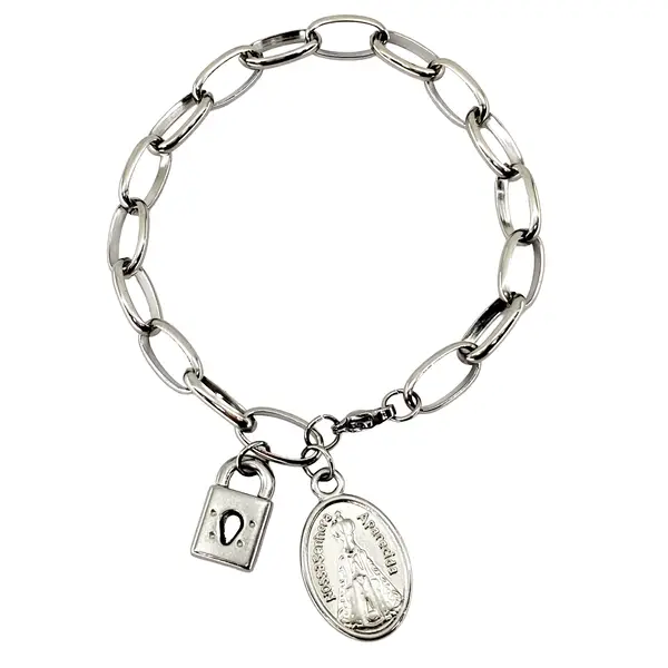 Pulseira Cadeia Consagração Aço Inox N.Sra. Aparecida Oval com Cadeado