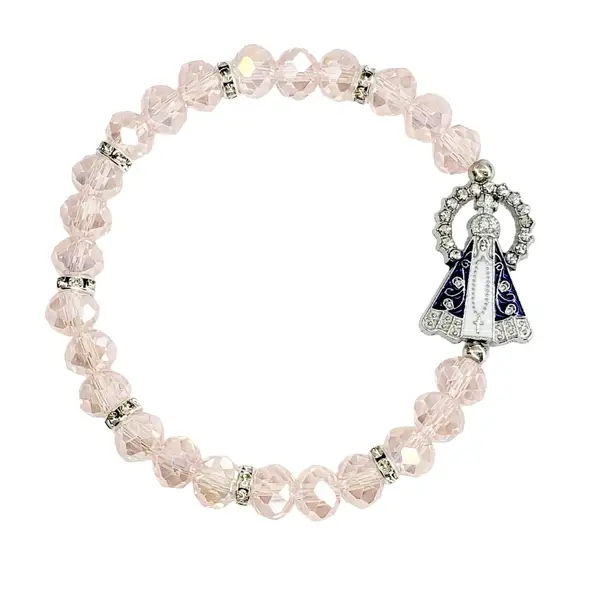 Pulseira Prateada Nossa Sra. Aparecida Fundo Branco Com Resplendor Miçanga Rosa