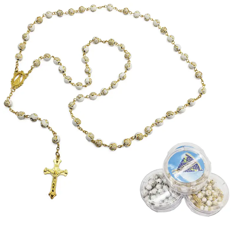 Apresentamos o Terço 8mm Nossa Senhora Aparecida com Rosas em Branco e Dourado, uma criação de rara delicadeza que une a devoção à Padroeira do Brasil a um design romântico e sofisticado. Este terço é perfeito para mulheres que buscam um objeto de fé que também seja uma expressão de sua feminilidade e bom gosto.